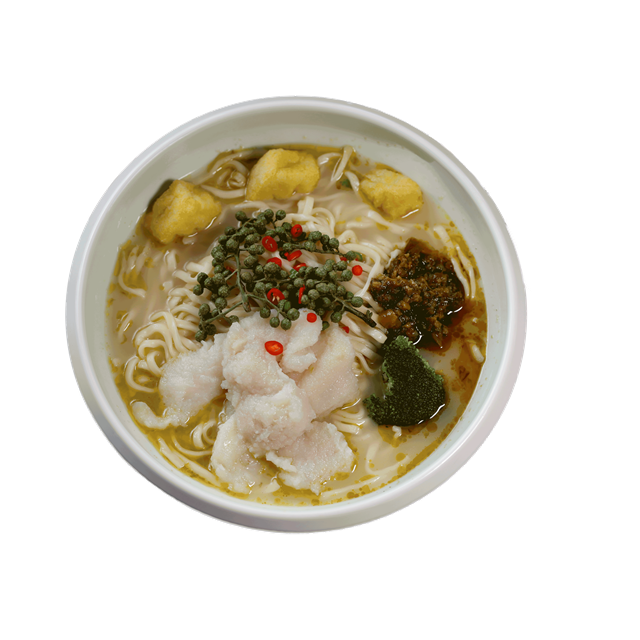 藤椒魚面制作方法:1.豬骨濃湯底料13克,開水400克調好備用;西蘭花煮熟待用;2.生面煮3分鐘至熟撈出加入碗中;3.調好的骨湯400克,加入藤椒風味底料20克,腌制魚片、油豆腐,一起煮熟倒入碗中,加上輔料、蔥花即可。